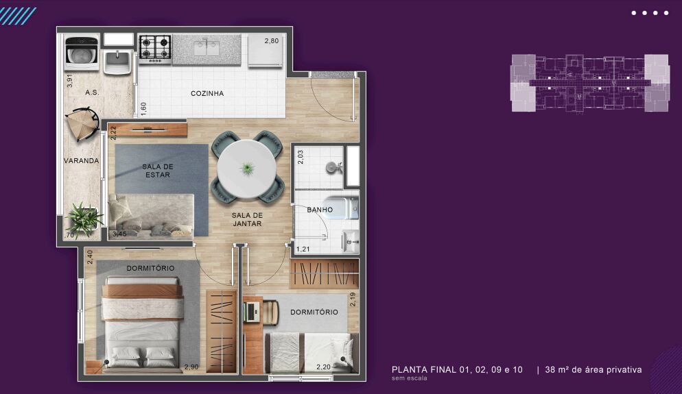 2 Dormitórios1 Banheiro1 Vaga1 Copa1 Cozinha1 Sala de jantar1 Sala de estar1 Área de serviço